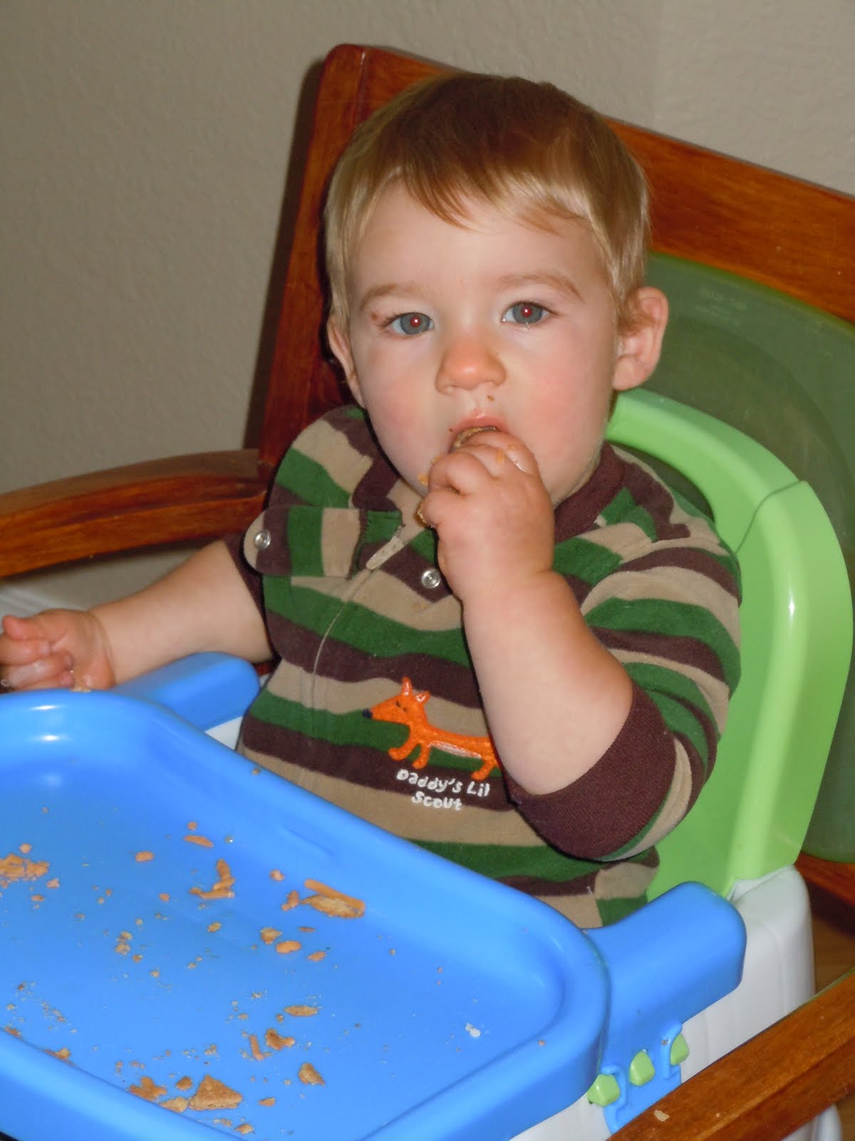 When his tray on the highchair is empty, he grunts and pounds his fist on the table, as a signal that he is ready for more.